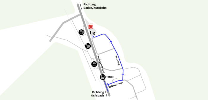 Von der Autobahn A1, Ausfahrt Baden-West, in Richtung Fislisbach auf Badenerstrasse und Mellingerstrasse bis zur Abzweigung «Täfern / Im Grund». Anschliessend den Wegweisern «Glaeser AG» folgen. Besucherparkplätze befinden sich vor dem Gebäude.