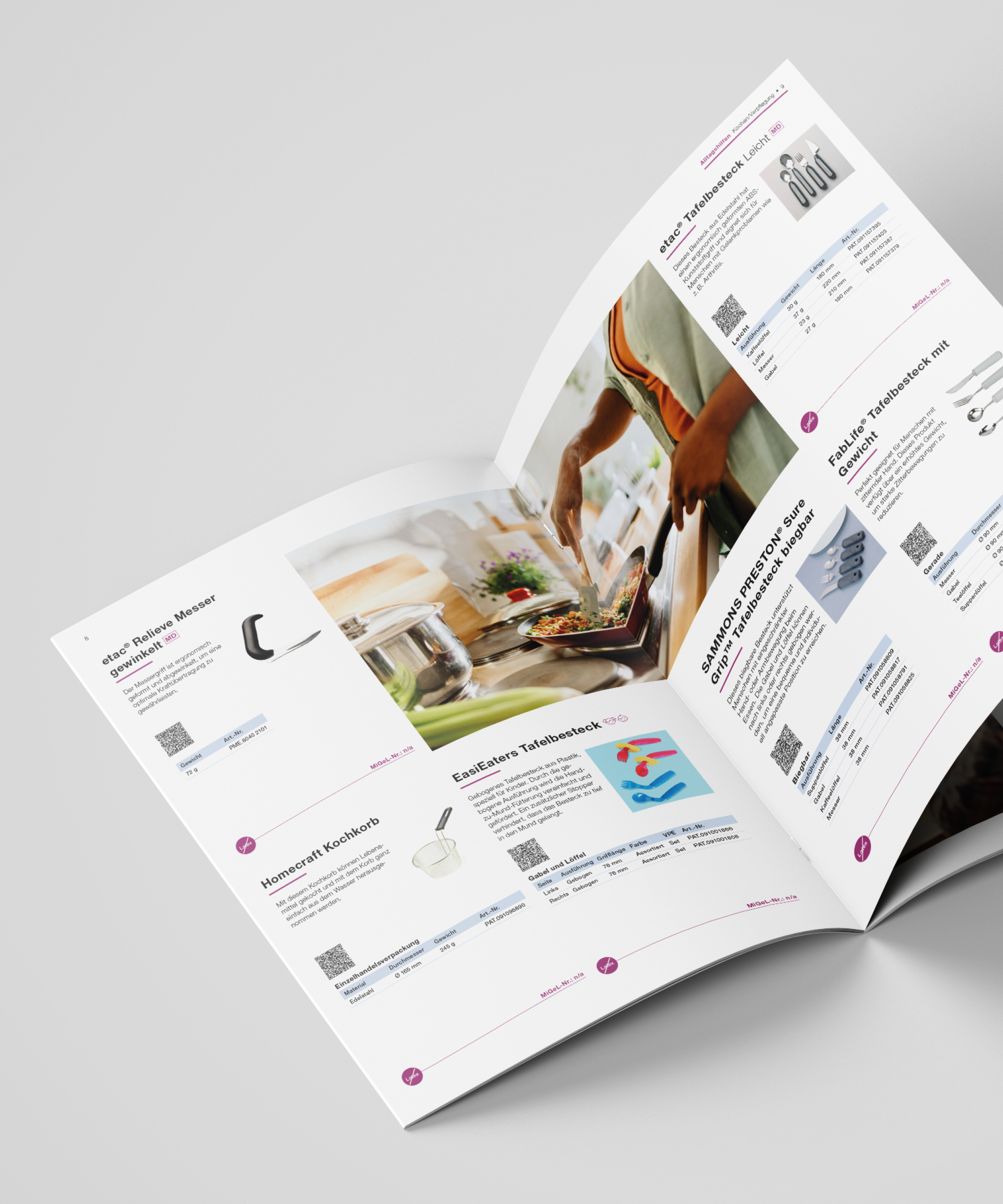 Zur erfolgreichen Umsetzung der Booklets gehörte neben einer stimmigen und differenzierenden Farbwelt, die Erstellung von Icons zur Unterstützung der Leseführung. Verschiedene interaktive Elemente ermöglichen zudem die einfache Bestellung im Webshop.